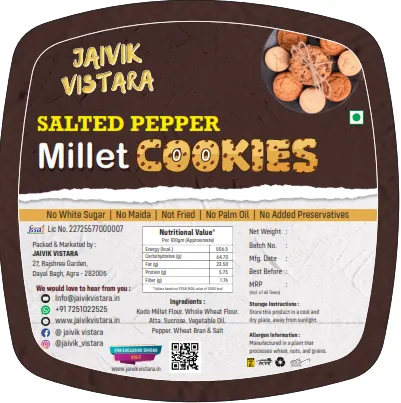 Salt and Pepper Cookies made with Kodo Millet and Whole Wheat Flour are a savory, crispy, and healthy snack—perfect for those who prefer something less sweet but still nutritious. These cookies are high in fiber, rich in minerals, and have a unique spicy twist from black pepper.