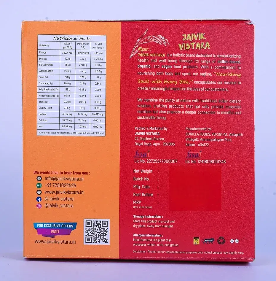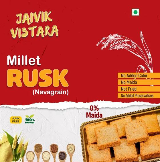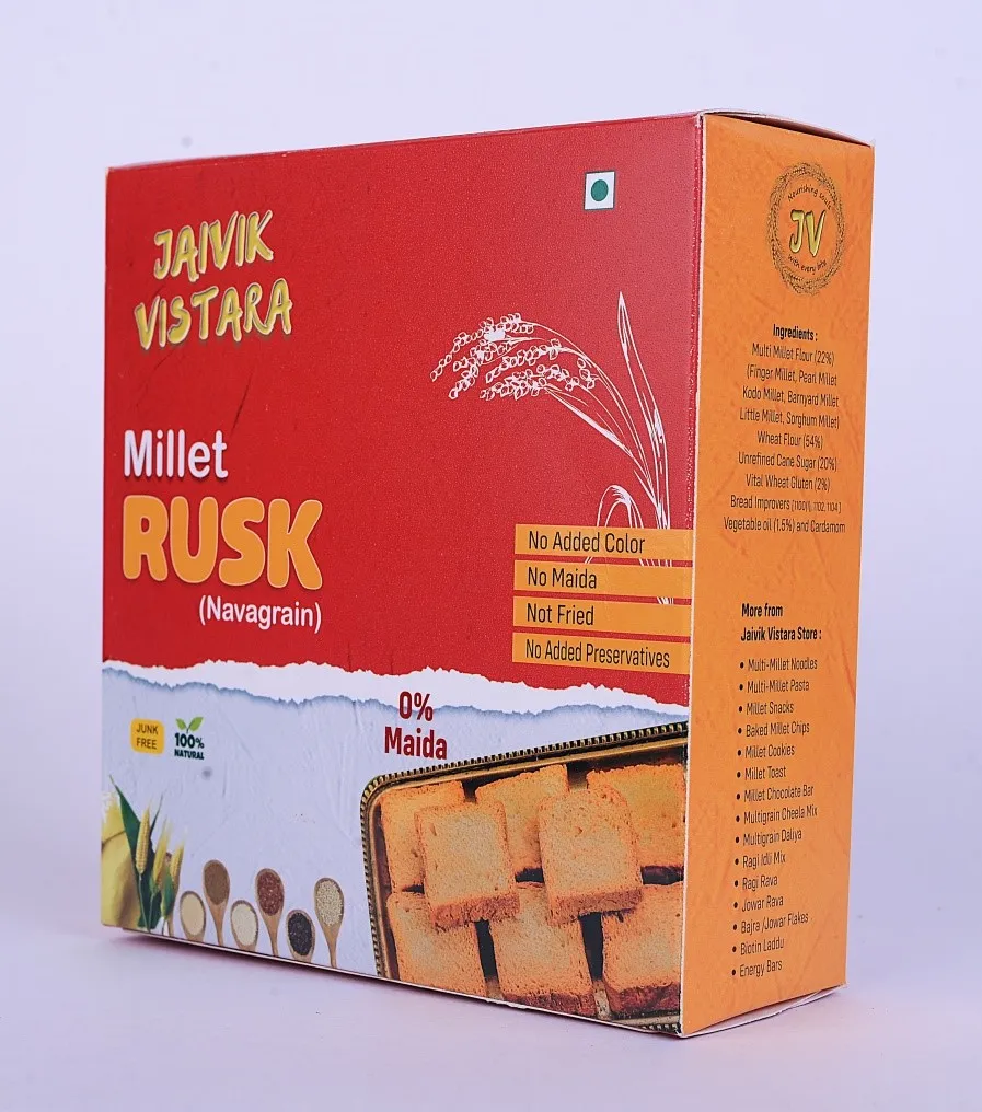 Enjoy the perfect blend of health and taste with Jaivik Vistara Navagrain Millet Rusk, made from 9 nutrient-rich millets for a fiber-packed, protein-rich, and gluten-friendly alternative to regular rusks. These crispy, golden-baked rusks are free from maida and refined sugar, offering a delicious and guilt-free snacking experience!